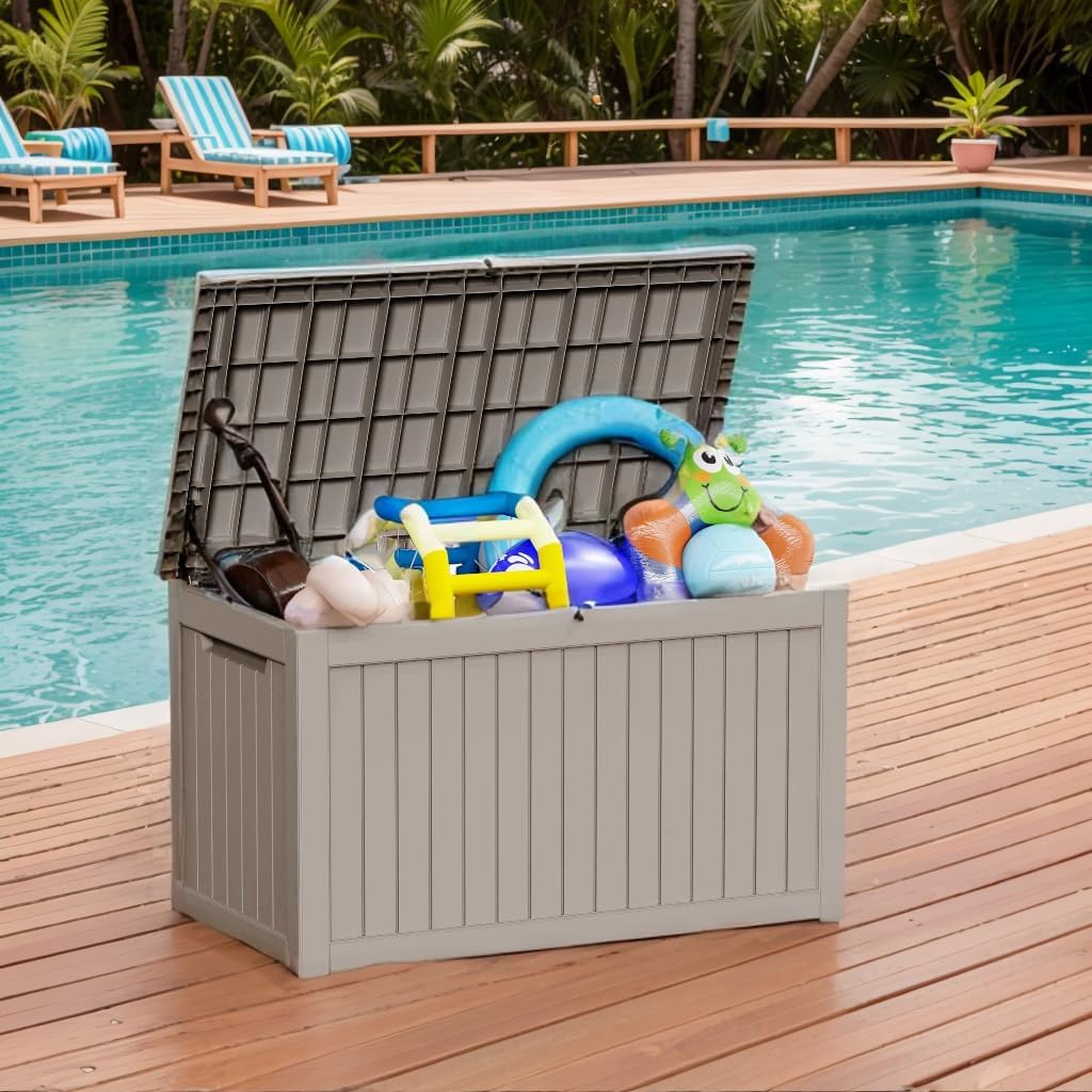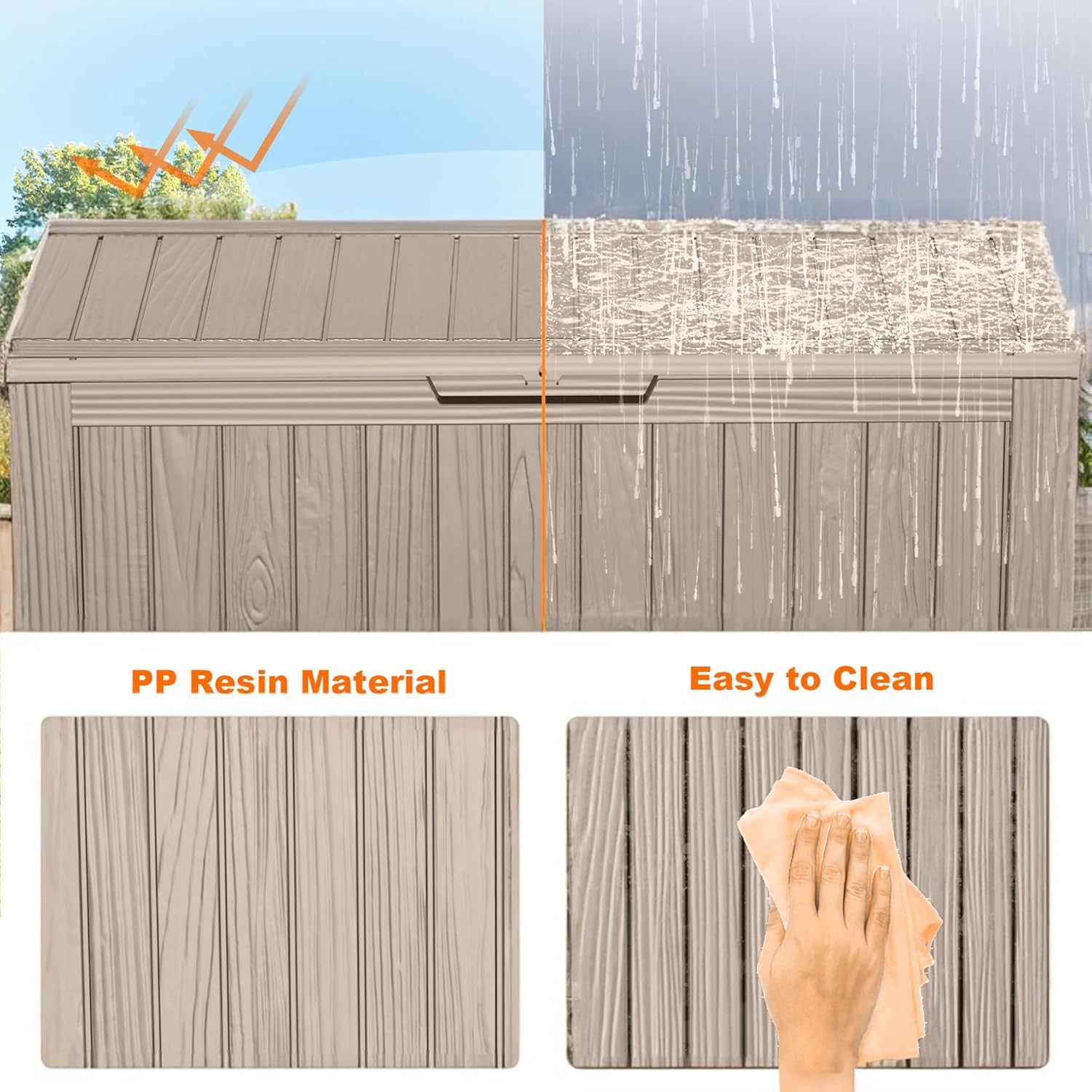 Reinforced corners for maximum durability and a snug fit. The lid opens and closes smoothly with spring-loaded gas struts, making it finger-proof, ensuring easy access. Designed for simple assembly, it can be assembled in less than 30 minutes with the help of a family member or friend. The sturdy lid doubles as a bench or table and features a sophisticated, stylish wood texture.