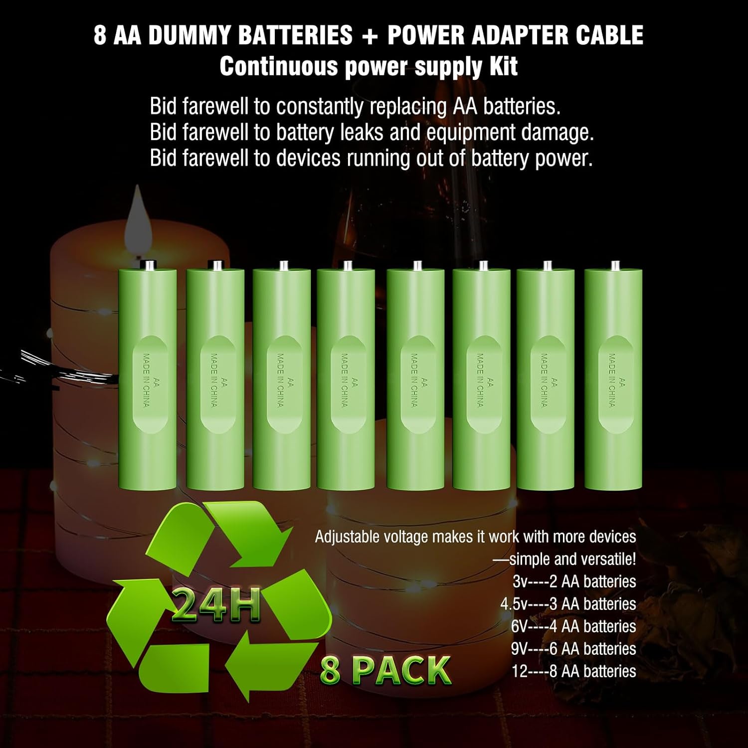 | BuiltIn Media | 7*AA dummy battery,1*AA dummy battery with flat cable,1*12W 3V 4.5V 5V 6V 7.5V 9V 12V Adjustable Voltage Universal AC Adapter Power Supply |