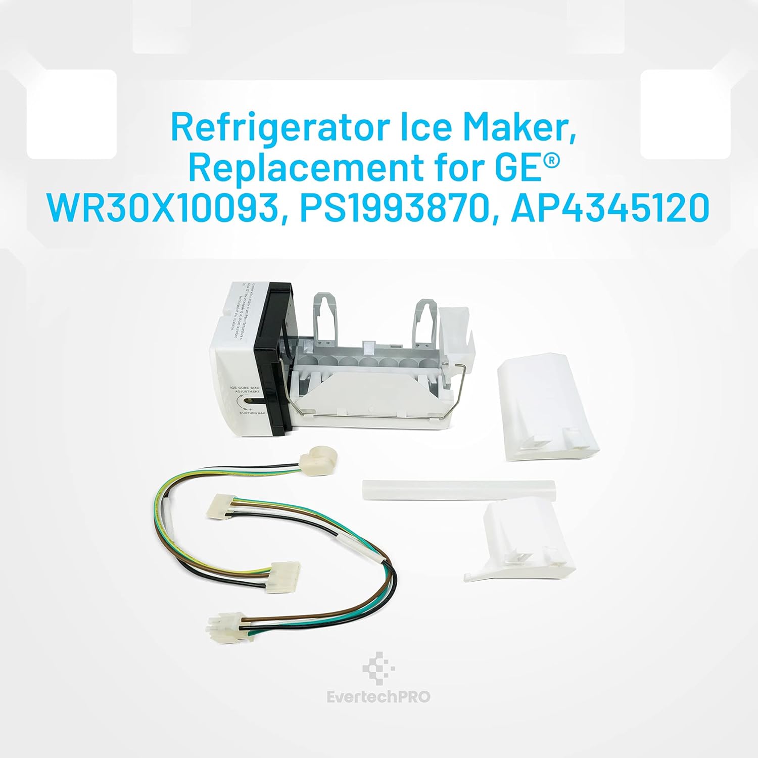 Experience simplicity and efficiency with the EvertechPRO Ice Maker for Refrigerator. This high-quality fits GE icemaker replacement is the perfect solution for any kitchen or outdoor refrigerator ice maker needs. Engineered with precision, this ice maker is compatible with GE Refrigerators, serving as a functional equivalent to OEM specifications. This ice maker assembly is a direct replacement for WR30X10093 Ice Maker and fits GE ice maker wr30x0327, making it a versatile choice for your refrigerator. The EvertechPRO Ice Maker is a comprehensive kit that includes power cords and end-mounted fill cups, ensuring a hassle-free installation process. It is crafted to be durable, reliable, and easy to install, making it a convenient choice for your kitchen or outdoor needs. With this Ice Maker for fridge, you won't have to worry about the longevity of your appliance. This compatible with GE Ice Maker auger comes with the replacement refrigerator ice makers kit, which includes all the necessary parts for a complete setup. It is an ideal replacement for the WR30X0327 fits GE Ice Maker, ensuring that you always have ice on hand when you need it. The EvertechPRO compatible with GE Icemaker Kit fits GE refrigerator models, making it an excellent choice for GE Ice Maker parts among compatible with GE ice makers. The EvertechPRO fits GE fridge ice maker is not just a simple ice maker, it's a solution for all your ice needs. Whether you need an icemaker for GE Refrigerator or a compatible with General Electric Ice Maker, this product has got you covered. This high-quality refrigerator ice maker is designed to deliver excellent performance, ensuring that you always have ice ready when you need it. The EvertechPRO Ice Maker is more than just a replacement refrigerator ice maker; it's a testament to the quality and reliability that EvertechPRO stands for. So, whether you're looking for an ice machine replacement, a fridge ice maker an ice maker refrigerator, or ice maker parts for ge, consider the EvertechPRO Ice Maker for your refrigeration needs. It's time to upgrade your ice-making experience with EvertechPRO! EvertechPRO Refrigerator Replacement Ice Maker Assembly Part Number WR30X10093 replaces WR30X10061 WR30X10014 WR30X10012 1399596 5304406551 AH1993870 EA1993870 JS2 MSE1 PS1993870 WR29X5144 WR30M0149 WR30M0153 WR30M149 WR30M153 WR30X0138 WR30X0147 WR30X0148 WR30X0159 WR30X0169 WR30X0199 WR30X0203 WR30X0213 WR30X0214 WR30X0238 WR30X0241 WR30X0259 WR30X0282 WR30X0283 WR30X0289 WR30X0290 WR30X0304 WR30X0306 WR30X0307 WR30X0310 WR30X0315 WR30X0318 WR30X0320 WR30X0327 WR30X0328 WR30X0329 WR30X10044 WR30X10058 WR30X10082 WR30X10109 WR30X138 WR30X147 WR30X148 WR30X159 WR30X169 WR30X199 WR30X203 WR30X213This is not a GE OEM product. Fits GE Refrigerator and fits GE fridge icemaker. Compatible with A4425GDTABB A4425GDTAWW A4425GDTBBB A4425GDTBWW BIS42AJB BIS42AJC BIS42AJD BISB42EKB BISB42EKB BISB42EKC BISB42EKC BISB42ELB BISB42ELB BISB42ELC BISB42ELC BISB42ELD BISB42ELD BISB42ELE BISB42ELE BSS25GFPACC BSS25GFPAWW BSS25GFPCCC BSS25GFPCWW BSS25GFPDCC BSS25GFPDWW BSS25GFPECC BSS25GFPEWW BSS25GFPHCC BSS25GFPHWW BSS25JFRFWW Use of the Manufacturers trade names and logos are the registered trademarks of their respective owners. Any use of the Manufacturers brand name, part numbers or model designation for this product is made solely for purposes of demonstrating and for identification compatibility and are displayed for descriptive purposes only. Use of them does not associated with, imply any affiliation or endorsement by any manufacturer.