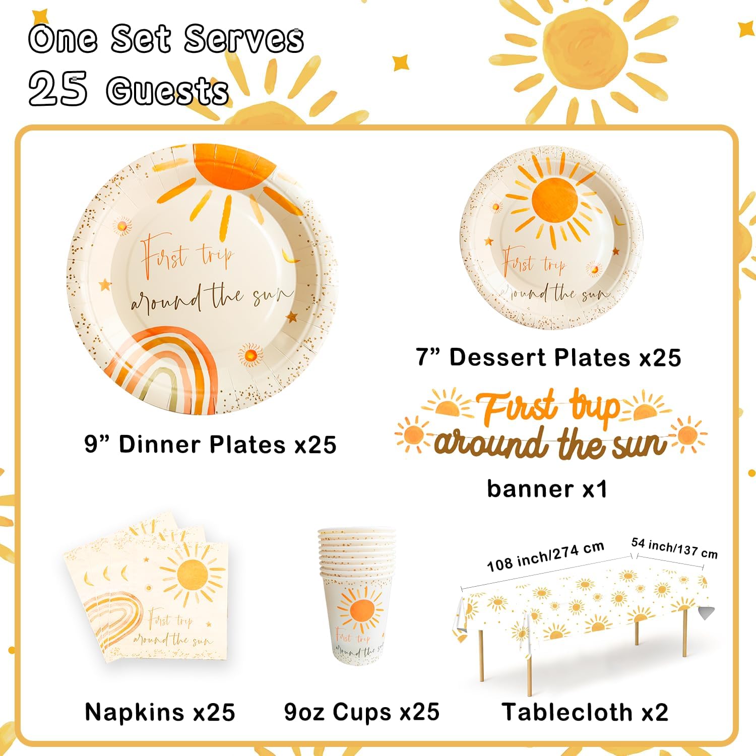 First Trip Around The Sun Birthday Decorations 25*dinner plates(9") 25*dessert plates(7") 25*napkins(6.5"*6.5") 25*paper cups(9oz) 2*tablecloth(54"*108") 1*first trip around the sun banner