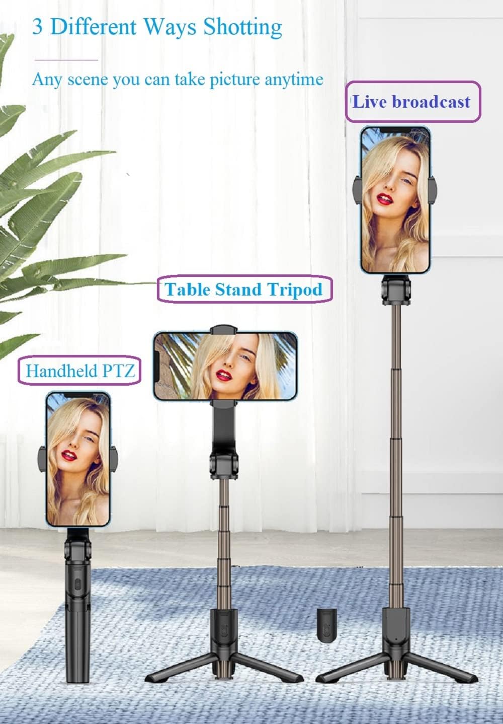 Mobile Phone Gimbal Stabilizer Outdoor Sports Shooting Anti-shake Handheld Gimbal Stabilizer Bluetooth Tripod Selfie Stick Compatible Devices: Cell phone Compatible with: Bluetooth 5.0 Universal Item Dimensions: HxWxL 1.24x1.52x8.28 inches(12.4x38.5x210mm) Maximum pulling length: 32.3inches (820mm) Item Weight: 6.53 ounces (185g) Battery capacity: 500mah Item No.: Video Stabilizer Material: ABS+Aluminum alloy Vertical rotation angle: 360° Packing list: packing box + stabilizer +Charging Cable+ manual Phone gimbal stabilizer selfe stick tripod selfe stick stabilizer, Quality assurance 4 integrate upgraded version stable solid support rod fits all kinds of mobile phones without pressure, increased the card slot design is more stable when using, and design for using in handheld or on desktop is more stable and clear, even intelligent anti shake Portable Aluminum alloy telescopic rod of phone gimbal stabilizer is easy to carry, stable, light and more durable. Also size of cell phone stabilizer for video recording is small, convenient to put in pocket and handbag. fits travel and outdoor sport and selfe stick stabilizer with remote fits all kinds of iPhone, Samsung, as well as Android smartphones. Using this phone video stabilizer handheld, One Key click fully automatic stable and balance shooting, easy to shoot for professional image, although hand shaking, scene shaking, but picture non-shaking!