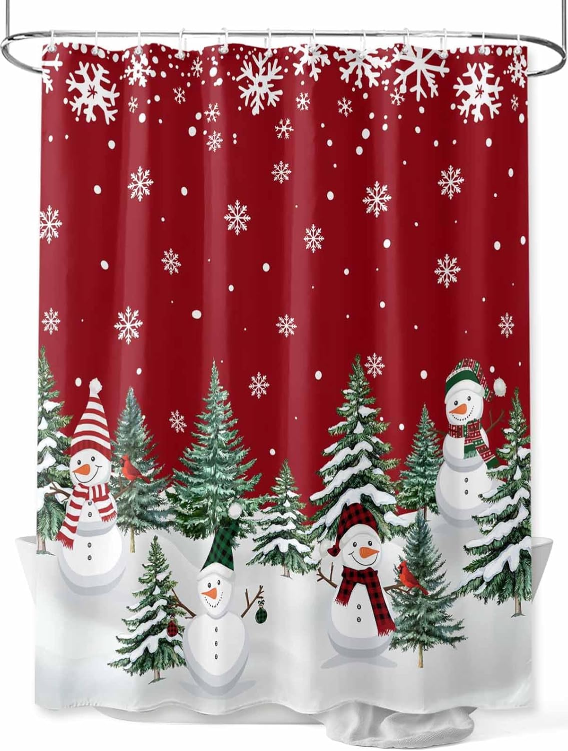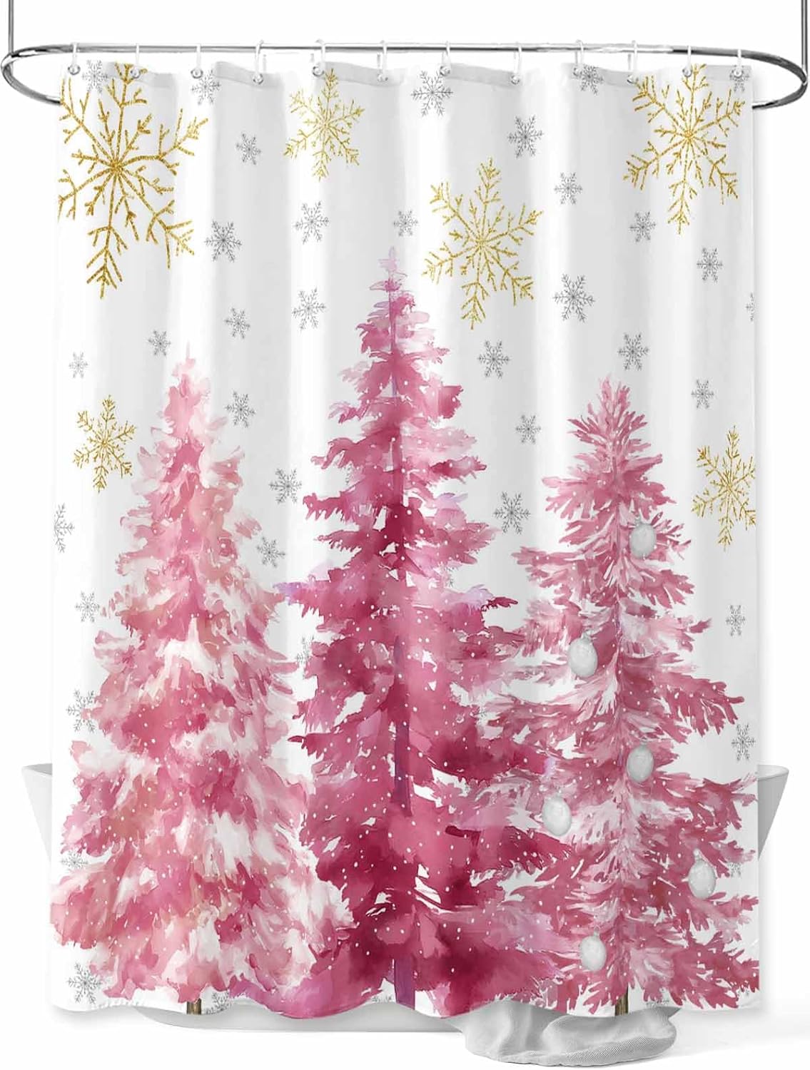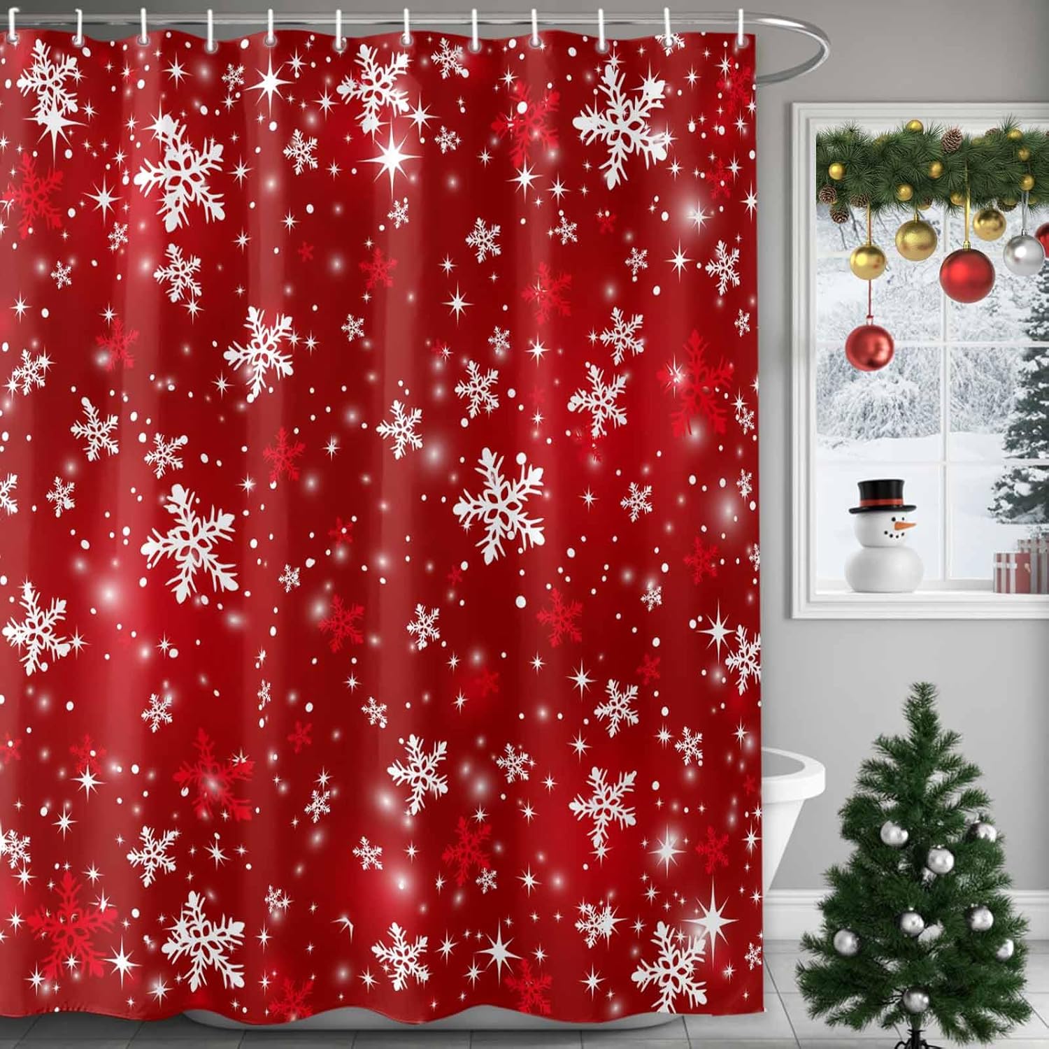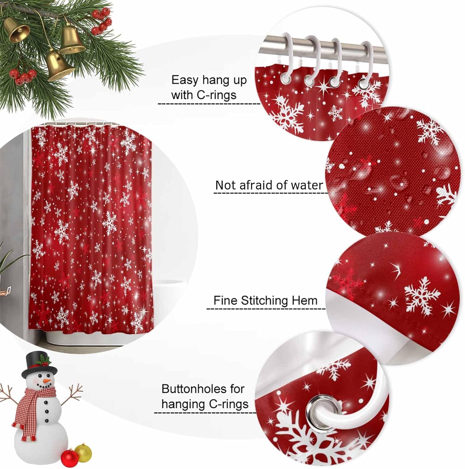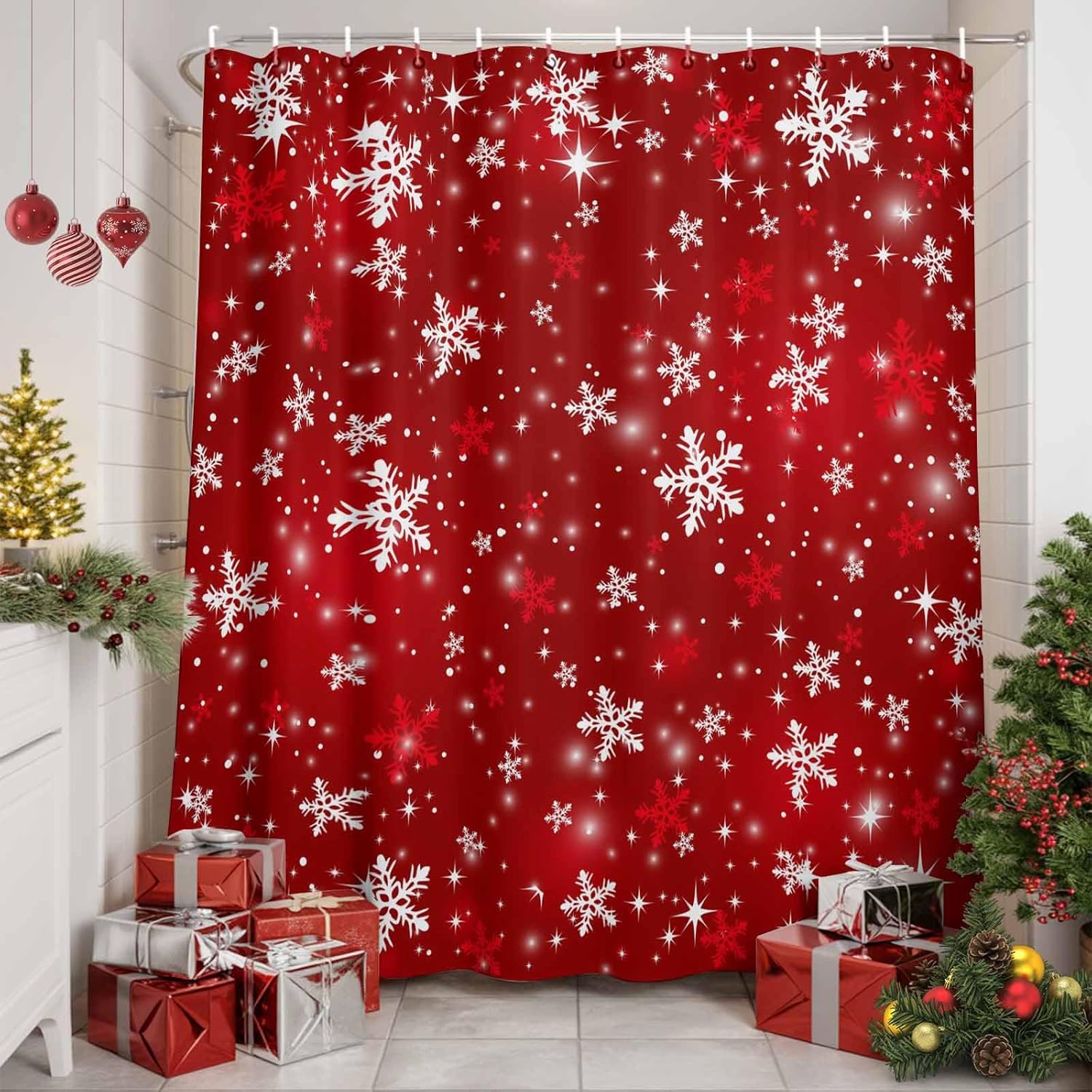 Christmas Shower Curtain, Waterproof White Fabric Shower Curtains, Snowflake Shower Curtain for Bathroom Xmas Decor AccessoryPackageOur shower curtain set includes 1 shower curtain and plastic hooks.Premium MaterialSoft polyester fabric to touch, lightweight, waterproof, reusable and detail sewing, machine washable. It can prevent the splashing of water from the bathtub during bathing.Fine Stitching HemSew along all edges to prevent tearing, durable throughout long-term use.Grommets for TearproofThe metal grommets promote easier hanging and long-lasting strength. Easy to HangEasy to install and hang, with free hooks, fits most bathrooms.Perfect AdditionEffortlessly add a polished feel to your bathroom with this design-minded shower curtain. Classic style and xmas patterns to create a chic winter shower atmosphere.Multi SizeWith a variety of sizes of shower curtain, you can choose the size that suits you according to the actual measurement.Size Dimension:36x72IN=91x183CM454x78IN=137x198CM60x72IN=152x183CM66x72IN=168x183CM72x72IN=183x183CM72x78IN=183x198CM72x84IN=183x214CM72x96IN=183x244CMWarm Tip1. Since we use different displayers, the color of the picture you see may be different from what we see.2. We measure include the edge size, the actual you feel maybe a little shorter, but will not affect your using, please understand. The important, the shower curtain leaves away the ground will be better for hygiene.
