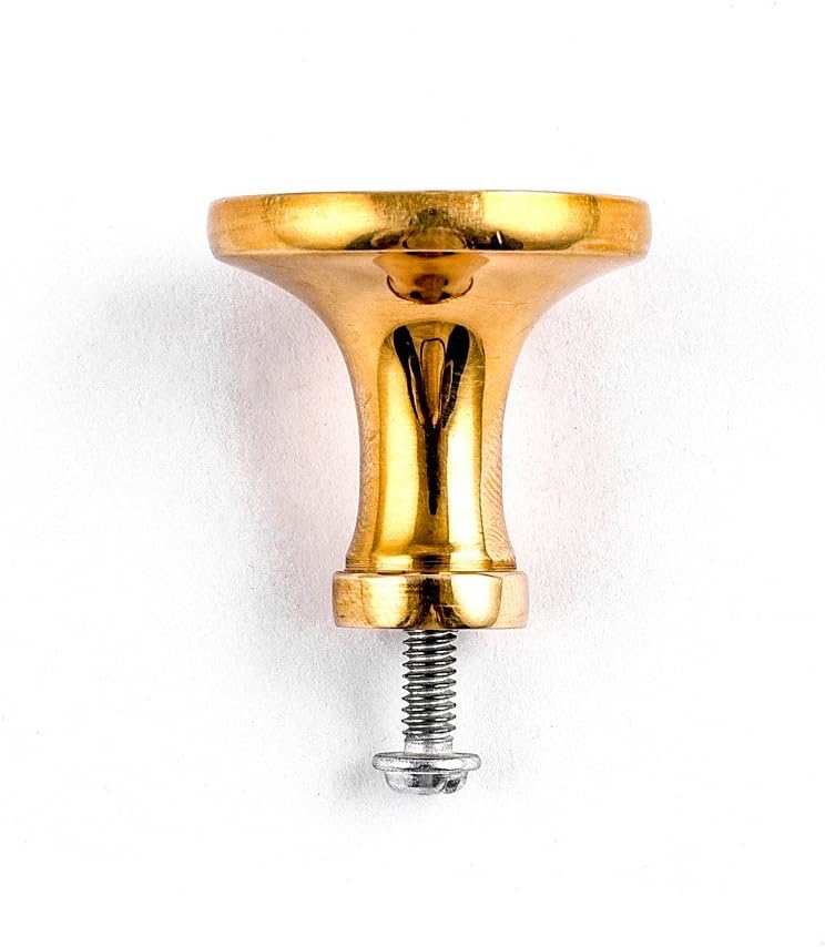 SHINY ROUND PLAIN SOLID CAST BRASS CABINET DOOR KNOB HANDLES This round contemporary cabinet or dresser drawer knob pulls are made of high-quality solid cast brass material and polished with a bright brass finish. It can be the very key to bringing your home design altogether.FEATURES - A beautifully crafted minimal design that looks great on any piece of furniture - Exclusive shiny brass polish over solid cast brass construction - Its flat backplate can be mounted on any flat flush surface- Is guaranteed not to tarnishDIMENSIONS - Diameter: 1.25 Inches - Projection: 1.25 Inches - Backplate Diameter:0.5 Inch - Screw Holes: 1DURABLE ROUND BRASS KNOB PULLSThese sturdy small brass door knobs are suitable for a wide range of applications like windows, storage or kitchen cabinets, dresser drawers, closets and cupboards. The brilliant brass edging with bright brass coating won't lose its shine for a long timeMOUNTING HARDWARE INCLUDEDThe package includes complementing screws for hassle-free installation. The cabinet pulls are carefully wrapped and packed to avoid any damage during the transit period.