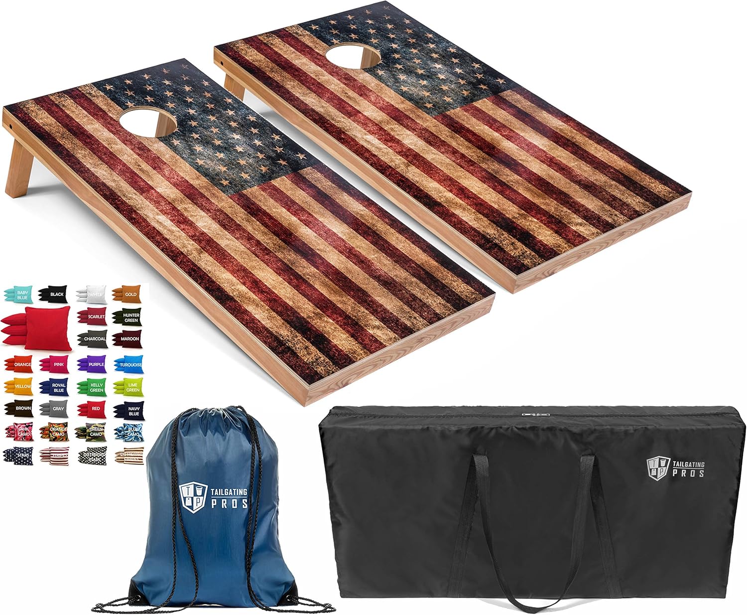 Tailgating Pros Cornhole Set w/ Bean Bags Includes - Two Regulation Size (4ftx2ft) wooden cornhole boards and 8 regulation size cornfilled cornhole bags. The Regulation Size boards measure the classic 4ft x 2ft and have a back cross bar to prevent bouncing of the board. Our Cornhole Boards have an advanced design allowing them to weigh only 13 - 15lbs each. The boards have a 1/2” Top Board and are held together with Mitered Joints, Heavy-duty Hardware, and are equipped with Folding Legs. The total set weighs between 34-38lbs, making them easy to transport, compared to a typical set that weighs upwards of 60 lbs. Our Carrying Case is made of High Quality Polyester which offers Convenience and Protection. Use anywhere - Great for tailgates, barbeques, parties, weddings or just backyard fun and are sure to provide hours of entertainment for the whole family. If the Bag Color Combination you would like is Not Listed, please Choose our CUSTOM COLORS Option from the Drop Down Menu and Message us the Two Colors you would like. We offer 20 Solid Colors, 4 Camo Patterns, and our 4 Stars and Stripes Themed Bags.