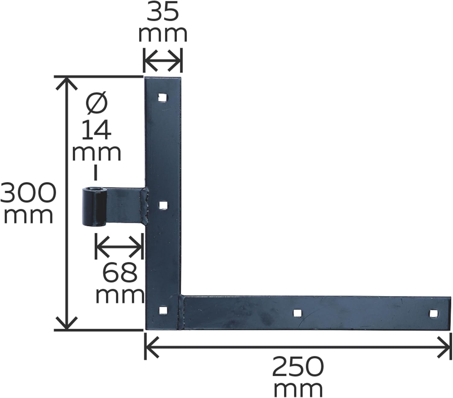 Shutter angle sectionStraight endMade of Raw steelSurface: Brushed black cataphoric paintMaterial thickness: 4.0 mmRoll of material 35 x 4 mmNumber of holes 5Hole 7.5 x 7.5 mmHeight: 250 mmLength: 300 mmRoller Ø14 mmWidth: 35 mmCentre distance - centreMounting hole 67.5 mm